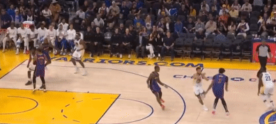 維金斯助攻追夢上籃,維金斯背身接應,助攻賈米凱·格林三分球;維金斯推追身,給庫裏一個三分球——維金斯連續三個助攻。