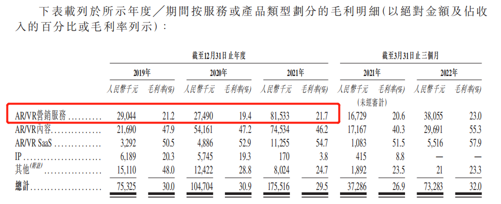 然而,與接連創下新高的收入相比,AR/VR營銷服務業務的毛利率卻沒那麼好看。各業務板塊中,收入佔比最高的AR/VR營銷服務的毛利率卻是最低的,近三年始終在21%左右浮動,毛利率超過50%的AR/VR SaaS業務體量卻一直沒有發展起來。