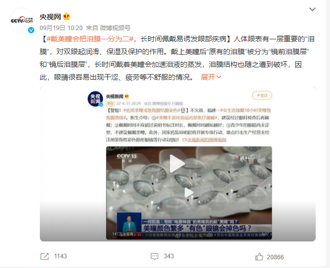 事實上,有關美瞳的負面消息層出不窮。在微博熱搜上,#戴美瞳會把淚膜一分為二#、#代表不建議年輕人戴美瞳眼鏡# 、#女生連戴10小時美瞳角膜險穿孔#等話題頻頻登頂,引發了更多網友對美瞳產品本身的質疑。