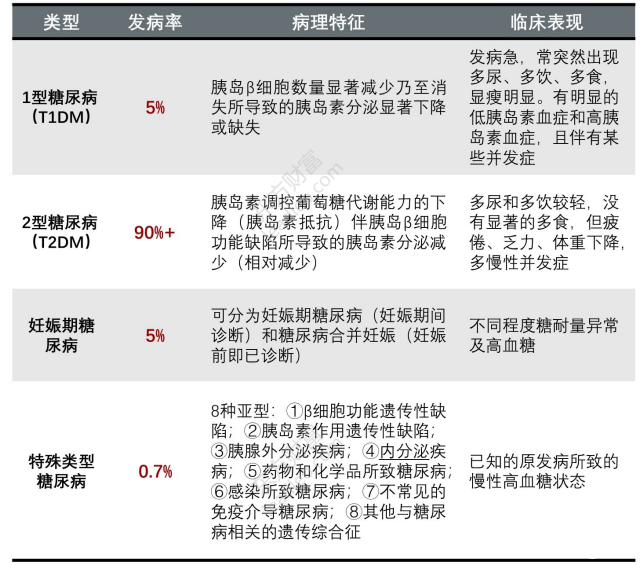 根據發病機制的差異,糖尿病主要被分為4大類型,分別是 I 型糖尿病、II 型糖尿病、妊娠糖尿病及其它類型,其中II 型糖尿病佔到整體糖尿病患者總數的90%。