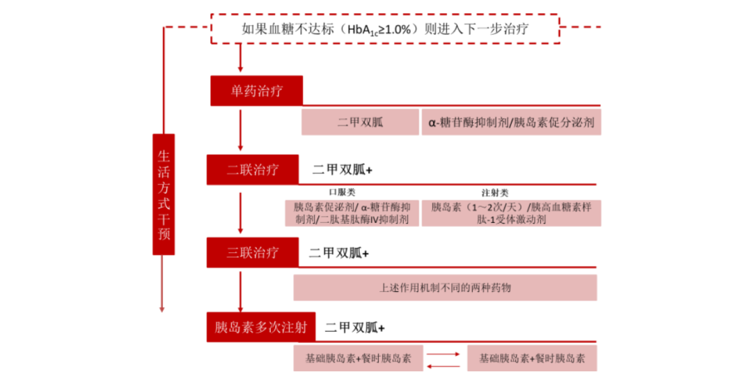 糖尿病主要有降糖藥物和注射胰島素兩大治療手段,其中二甲雙胍為2型糖尿病患者的一線用藥,在用藥早期有不俗的療效,但隨着疾病發展,血糖控制能力逐漸降低,當血糖控制不達標後,患者將開始增加聯用藥和注射胰島素。