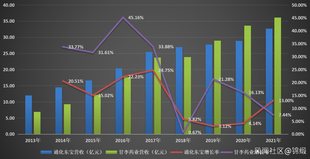 圖:通化東寶與甘李藥業營收及增速,來源:公告