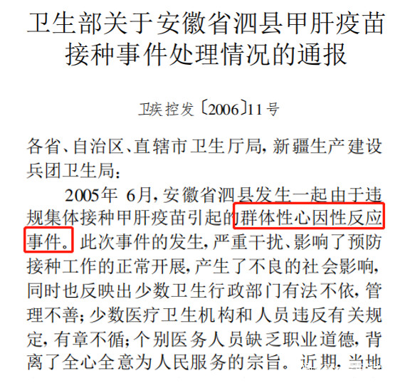 當地違規開展學校內的自費甲肝疫苗接種,1名兒童因巧合菌痢死亡,數十名兒童訴説身體不適並住院。國家調查組確認,兒童的健康問題與疫苗之間不存在因果關係,該事件被定性為羣體性心因性反應事件。説白了,這就是心理暗示引發的事件。