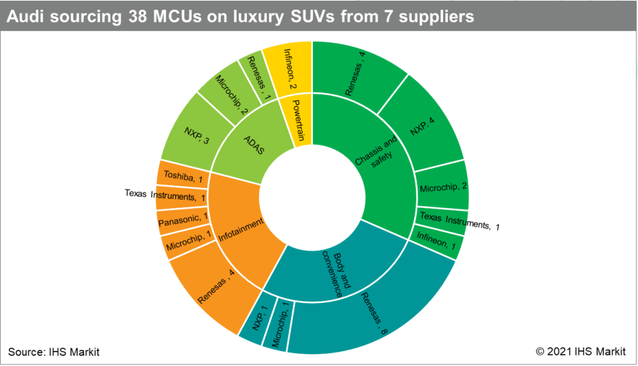 來看一台奧迪豪華型SUV在動力域、底盤和安全域使用MCU的情況。IHS對其分域使用的MCU做了分解,動力域採用了2顆英飛凌MCU;底盤和安全域採用了4顆瑞薩MCU、4顆NXP MCU、2顆Microchip MCU、1顆TI MCU、1顆英飛凌 MCU。
