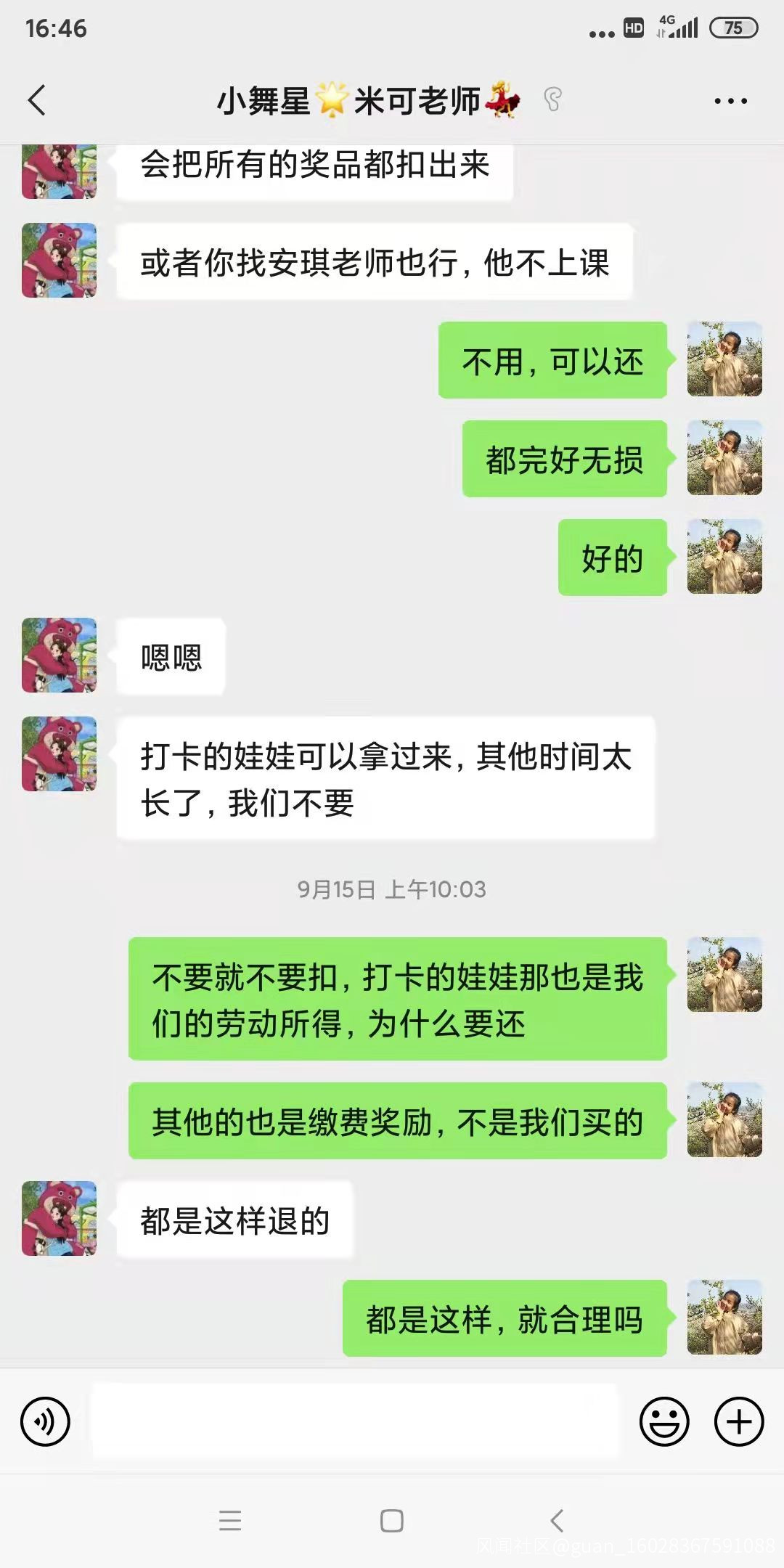2、送的東西不應該再扣錢(説是送,實際上是買的,已經算錢了,願意在上文已述),而且還是要2個學年分開算,第二學年只有一個兒童行李箱,而且這個只是做廣告吸引學員的手段而已,還要算錢?小舞星説不學了就不送了要算錢,那好,你不送了,我們可以還給你呀,為什麼不要還非要扣錢?打卡的娃娃也要算錢,真真又是豈有此理。