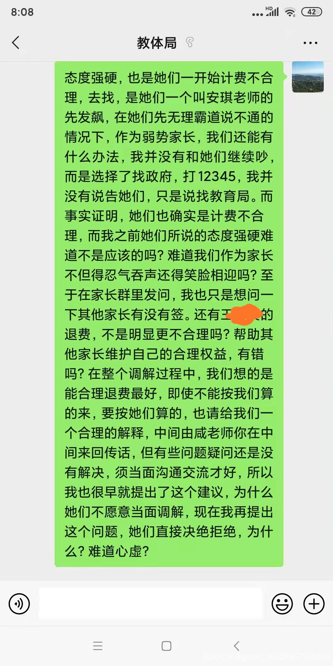 教育局在中間微信協調,協調了將近一個月,也沒有達成一致,有些問題僅靠微信協調是説不清楚的。我們不想再拉鋸下去了,要求教育局現場當面協調,如果小舞星説的合理,就按她們的計算退費。教育局傳達了我們的意見後,下面是小舞星的回覆。