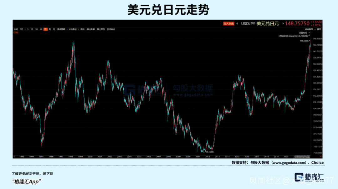10月14日,美元兑日元一度達到148.858,超過1998年金融風暴時期高點,為32年新高。