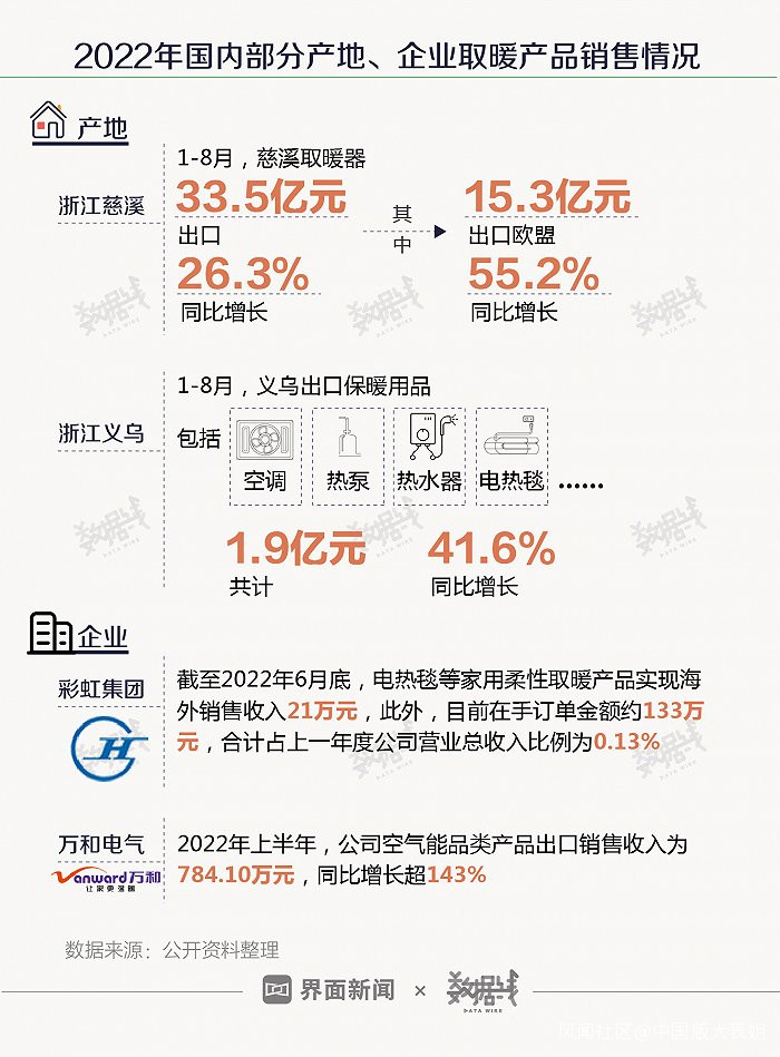 主要產地和企業賺錢了麼?義烏海關數據顯示,今年1-8月,義烏出口保暖用品,包括空調、熱泵、熱水器、電熱毯等共計1.9億元,同比增長41.6%。截至10月19日,電熱毯製造商彩虹集團總市值為38.13億元,相比9月初上漲近1倍。但據該集團公告,截至6月底,電熱毯等取暖產品實現海外銷售收入21萬元,目前在手訂單金額約133萬元,合計占上一年度公司營業總收入比例為0.13%。此前,彩虹集團曾表示,出口業務目前對公司業績不構成實質性影響。