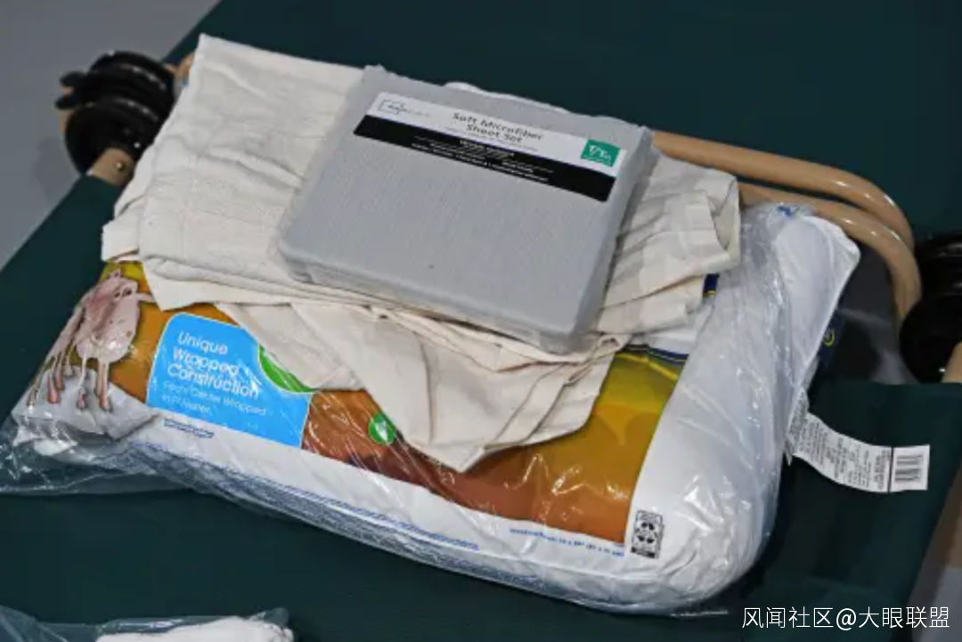 不過,考慮到遠道而來舟車勞頓的無證移民,或許不會隨身攜帶被褥家當,市政府貼心地為每個牀位上,放上了純棉的牀上用品套件。