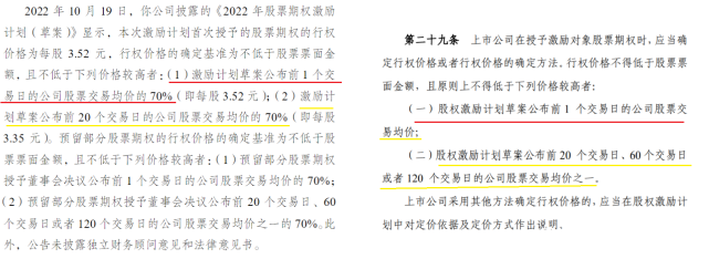 關注函指出,此次股權激勵的股票期權的定價低於《上市公司股權激勵管理辦法》第二十九條規定的行權價格。雷達財經注意到,第二十九條規定,上市公司在授予激勵對象股票期權時,應當確定行權價格或者行權價格的確定方法。行權價格不得低於股票票面金額,且原則上不得低於下列價格較高者:股權激勵計劃草案公佈前 1 個交易日的公司股票交易均價;股權激勵計劃草案公佈前 20 個交易日、60 個交易日或者 120 個交易日的公司股票交易均價之一。
