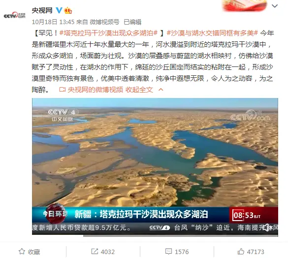 塔克拉瑪干沙漠裏出現了眾多湖泊!據“@央視網”報道,近期新疆塔里木河的河水漫溢到附近的塔克拉瑪干沙漠裏,形成了眾多湖泊,視頻報道吸引千萬網友圍觀,並衝上微博熱搜。