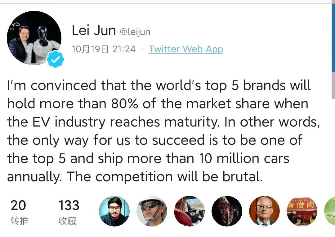 10 月 19 日,小米創始人雷軍在 Twitter 上説,“ 我們成功的唯一途徑是成為行業前五,並且每年出貨量超過 1000 萬輛。”