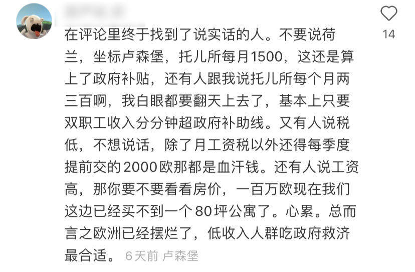 有在盧森堡的人説了當地的情況,他吐槽説總而言之歐洲已經擺爛了,低收入人羣吃政府救濟最合適。