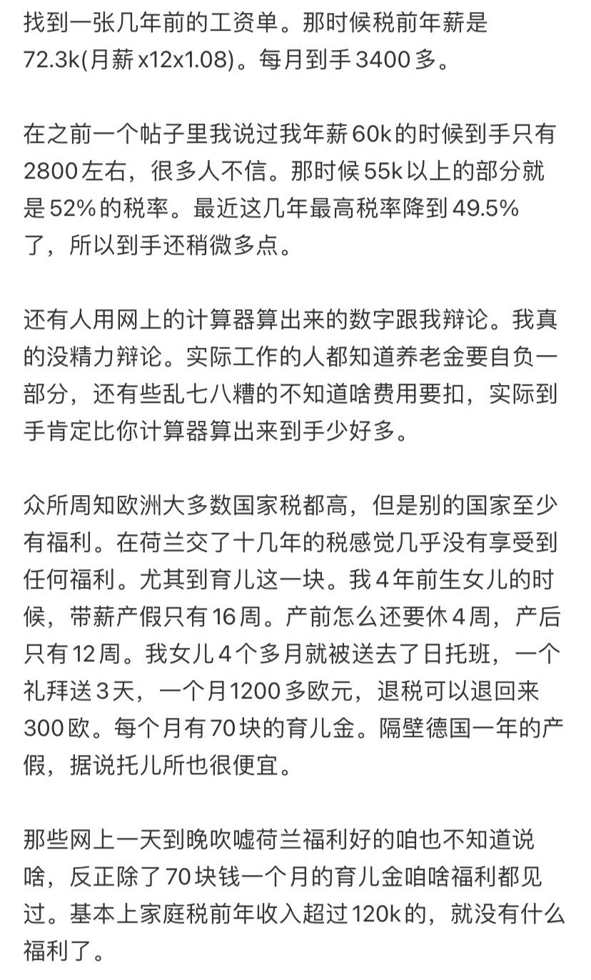 眾所周知歐洲大多數國家税都高,但是別的國家至少有福利。在荷蘭交了十幾年的税感覺幾乎沒有享受到任何福利。尤其到育兒這一塊。我4年前生女兒的時候,帶薪產假只有16周。產前怎麼還要休4周,產後只有12周。