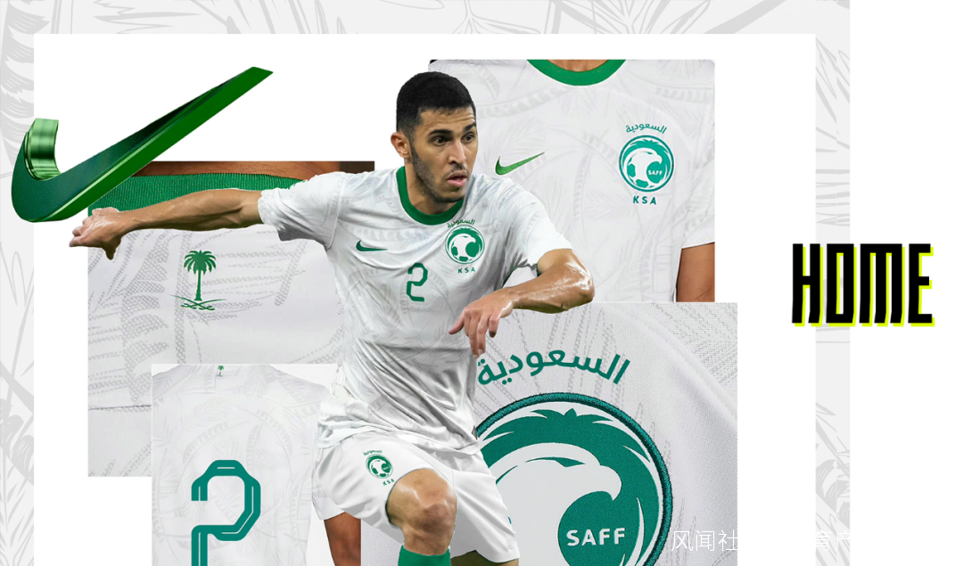 沙特的主場球衣採用了白色,領口一圈為綠色。球衣帶有棕櫚葉圖案,極富熱帶沙漠綠洲風情。客場球衣在綠色基礎上覆蓋了印花,印花與波蘭主場球衣肩部似是同款。