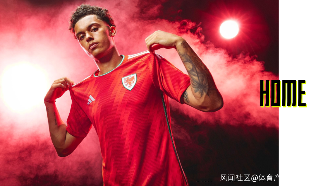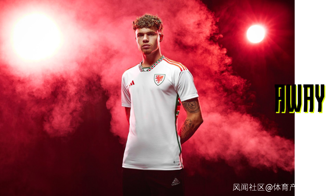 威爾士主客場球衣領口設計都別出心裁。主場紅色比客場白色更突出,配合宣傳照中從煙霧中走來的感覺,還真有點熱血的味道。