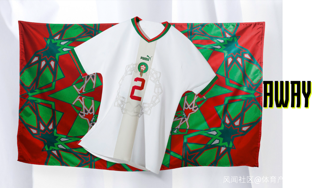 摩洛哥主場球衣結合了紅色和綠色,白色客場球衣印號周圍的圓形圖案,則取自於摩洛哥傳統馬賽克色調圖形。