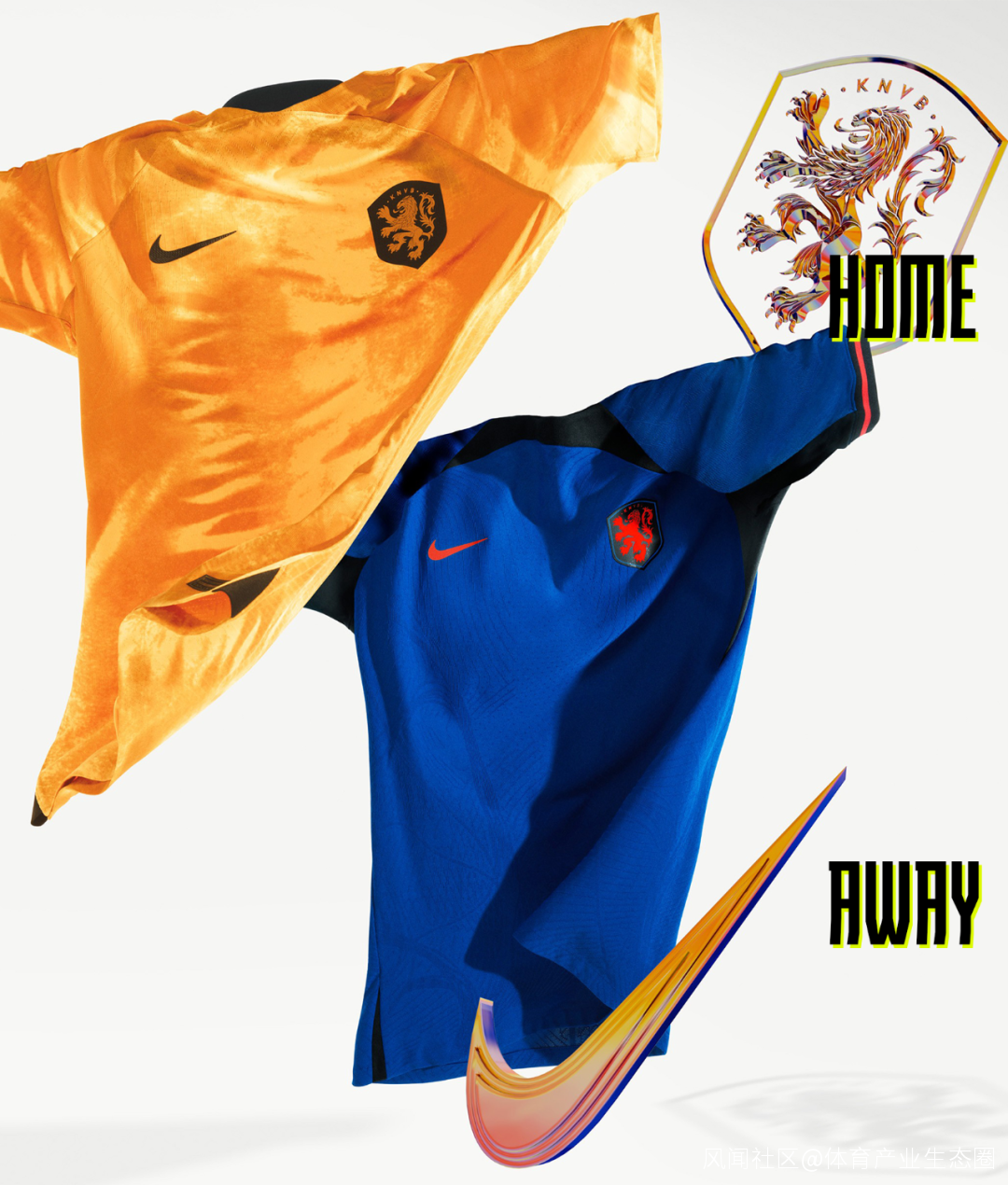 荷蘭的金黃色主場球衣穿上可以説是全場亮點,較高的飽和度帶來了一種類似絲絨的質感。客場藍色球衣的領口和腋下設計是小亮點,黑色的加入可以更好地讓球衣看起來貼合身材曲線。