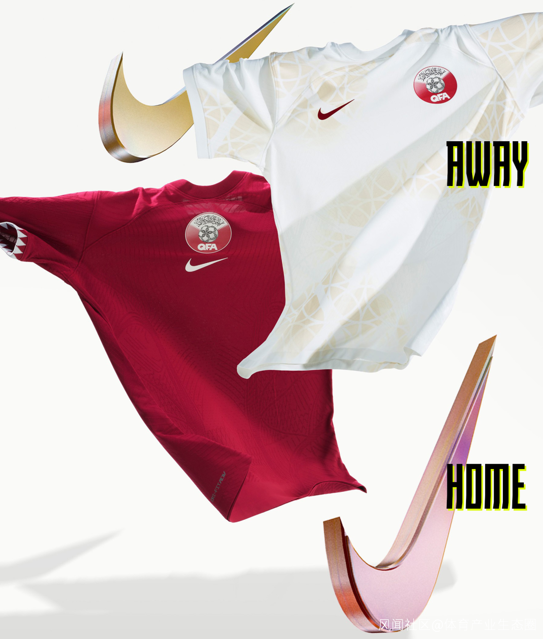 作為本屆世界盃的東道國,卡塔爾的主客場球衣是有點排面在的。主場球衣呈紅色,袖口處的鋸齒狀設計參考了卡塔爾國旗。客場球衣主體米白,金色印花如扎染一般分佈在球衣上。雖然簡單,但應該沒有人會覺得醜吧?