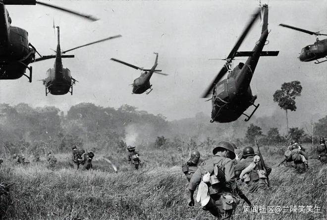 3.美國直升機將機槍火力傾瀉到南越的樹林中,以掩護軍隊的前進,1965年。