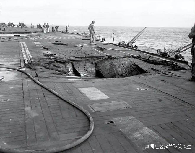 2.日本自殺轟炸機在美軍位於硫磺島的薩拉託加號驅逐艦的飛行甲板上留下了一個洞。