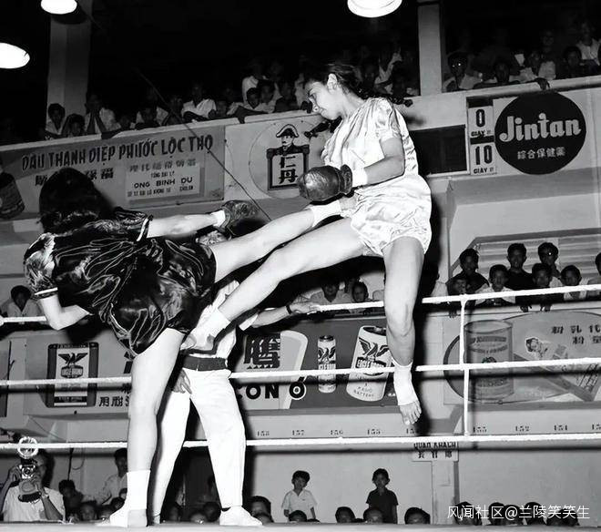 10.1965 年 4 月 3 日,女拳擊手在西貢體育場的羽量級冠軍較量中互相踢腿。