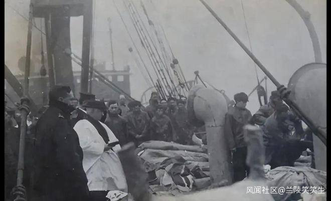 8.泰坦尼克號遇難者進行海葬。這張照片是 1912 年 4 月 24 日,也就是泰坦尼克號沉沒 9 天后,在麥凱班尼特電纜船上拍攝的。