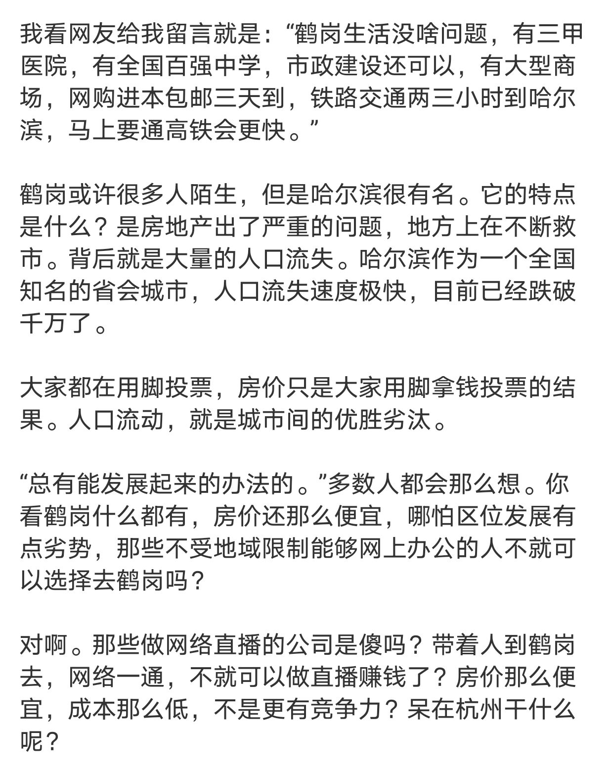 因為雖然鶴崗房子價格特別便宜,但背後其實是地方上大量人口流失導致的,十分嚴重的房地產問題。
