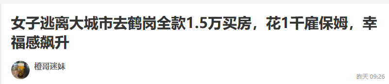 詳細的可以看這個帖子:《女子逃離大城市去鶴崗全款1.5萬買房,花1千僱保姆,幸福感飆升》