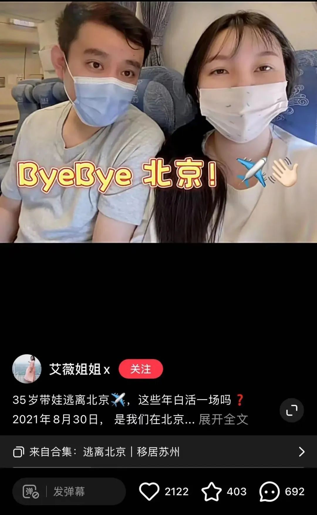 在小紅書上,博主@艾薇姐姐X置頂了自己移居的一條視頻,在視頻裏她自我介紹,35歲帶娃逃離北京,在北京生活了4450天,和家屬用5分鐘時間做了一個決定,賣掉北京的房子,移居蘇州。