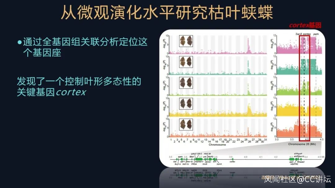 我們就去統計枯葉蛺蝶中華亞種不同的基因型和表型的一個頻率,這又是一個非常經典的遺傳學的研究方法。發現它們都各不相同,説明cortex不同的等位基因,它們已經演化了比較久的時間了。其實不僅僅是在枯葉蛺蝶中華亞種的種羣,我們在很多的枯葉蛺蝶屬的物種,都發現了葉形擬態的多態性。