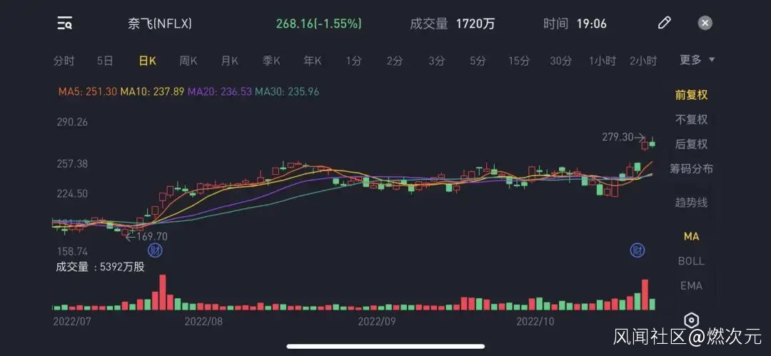 基於本季度奈飛的表現,財報公佈後,其盤後股價大幅上漲了近14%。截至北京時間10月21日美股收盤,奈飛股價報268.16美元/股,總市值1193億美元。