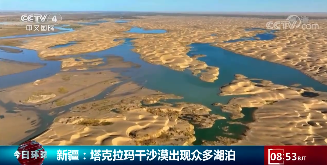10月18日,央視報道了一條新聞,説今年的新疆降水量很大,塔里木河水外溢到塔克拉瑪干沙漠,形成一片連綿不絕的湖泊。