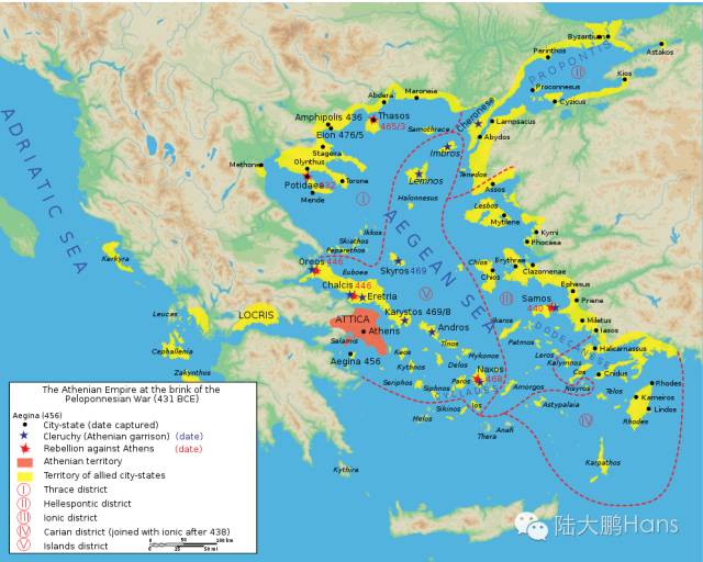 前5世紀,民主雅典的力量和繁榮主要依賴於它對其航海帝國的控制。雅典的航海帝國以愛琴海、愛琴海諸島和沿海城市為中心。雅典帝國最初是“雅典人及其盟友”的組織,現代學者稱之為“提洛同盟”,這是希臘各城邦自發組成的一個同盟,邀請雅典領導它們繼續開展反對波斯的解放戰爭,並向波斯復仇。提洛同盟逐漸演變成一個受雅典人控制的殖民帝國,主要是為了雅典的利益而運作(見地圖2)。提洛同盟的幾乎所有成員國都漸漸放棄維持自己的艦隊,而改為向集體金庫支付錢款。雅典人利用這些資金來擴充自己的艦隊,並向槳手支付報酬(槳手每年要有八個月待在槳位上),所以最終雅典海軍成了古希臘史上規模最大、戰鬥力最強的海軍。在伯羅奔尼撒戰爭爆發前夕,提洛同盟的大約150個成員國中只有2個島國——萊斯博斯島和希俄斯島——擁有自己的艦隊,也享有相對的自主權。但就連它們也不大可能違逆雅典的命令。