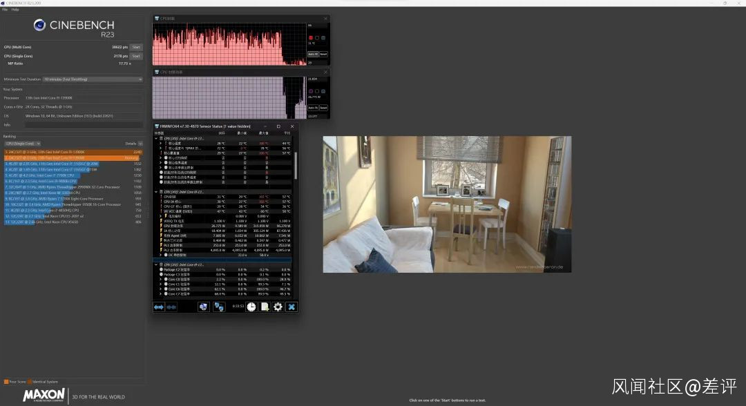 首先是常規的 10 分鐘循環測試,13900K 的多核成績達到了變態的 38622 ,和十二代 i9 拉開了一萬多分的差距。