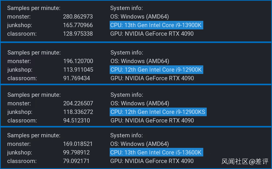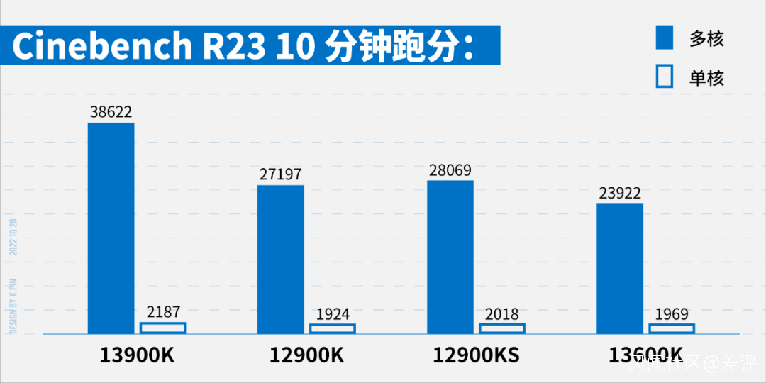 在官方給出的測試數據中,13600K 和 i9 們的跑分差距就顯現出來了,三項測試的得分均不在一個檔次上。