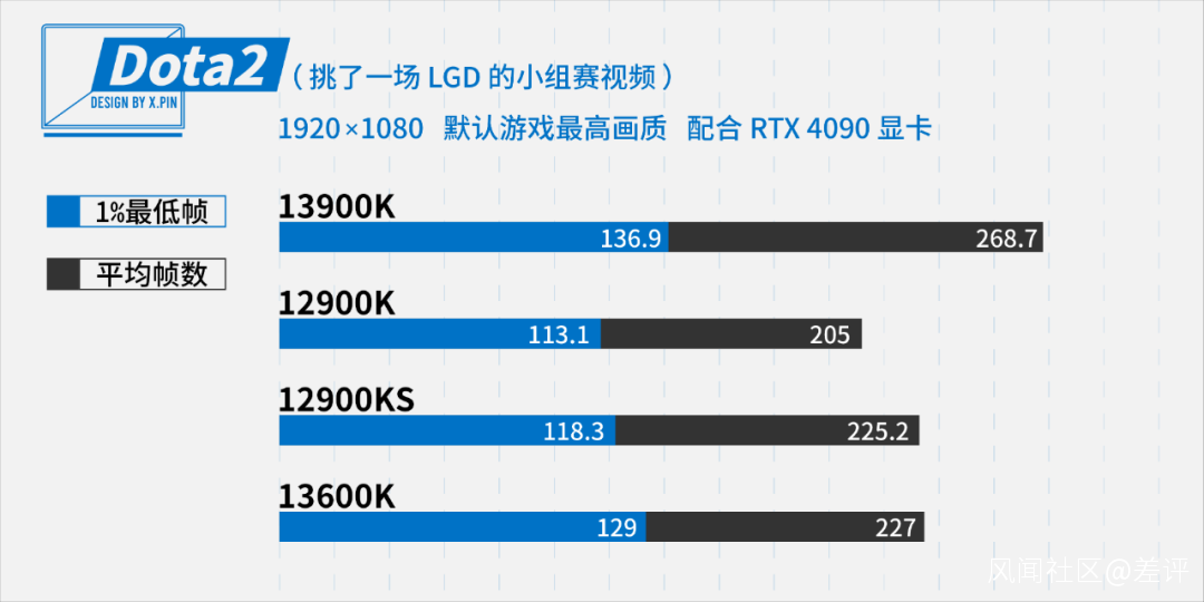 守望 2 的幀率對比的結果,和 DOTA 2 的結論類似,13600K 的跑分在守望 2 裏甚至還要再過分一些,有點和 13900K 平起平坐的意思了。