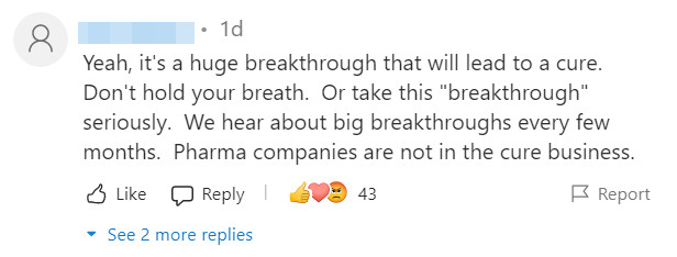 是啊,這是一個巨大的突破可以治癒疾病。不要屏住呼吸。或者認真對待這個“突破”。我們每隔幾個月就會聽到重大突破。製藥公司不從事治療業務。