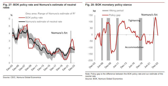 另有兩種發生概率不大的假設場景是:一是韓國為對抗通脹而過度緊縮貨幣政策(發生概率25%),這將令其到2024年中旬前維持政策利率高於3.25%的野村終端利率預測,即便美聯儲可能在2023年9月開始寬鬆週期。第二是更激進地降息(發生概率10%),韓國央行從2023底或2024年初開始大幅降息,追趕美聯儲的寬鬆步伐,共降息250個基點至政策利率為0.75%。
