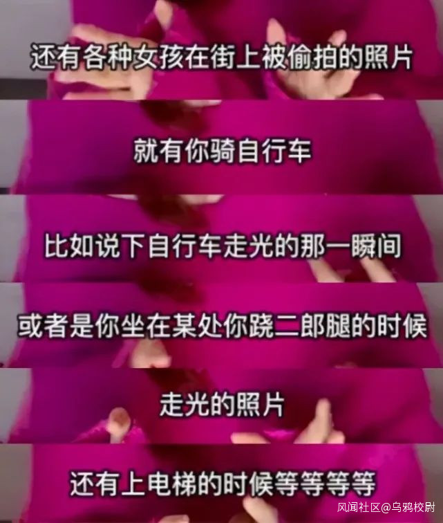 儘管@呢辣nina稱這些照片是“偷拍”,但是跟一般人理解的偷拍不一樣,這些照片並不是在衞生間、更衣室等私密空間拍攝的,就是在公共場合利用長焦鏡頭堂而皇之地拍攝,“有自行車下車走光一瞬間的偷拍,還有坐在某處蹺二郎腿的照片,隨便一組圖都有上萬瀏覽量”。