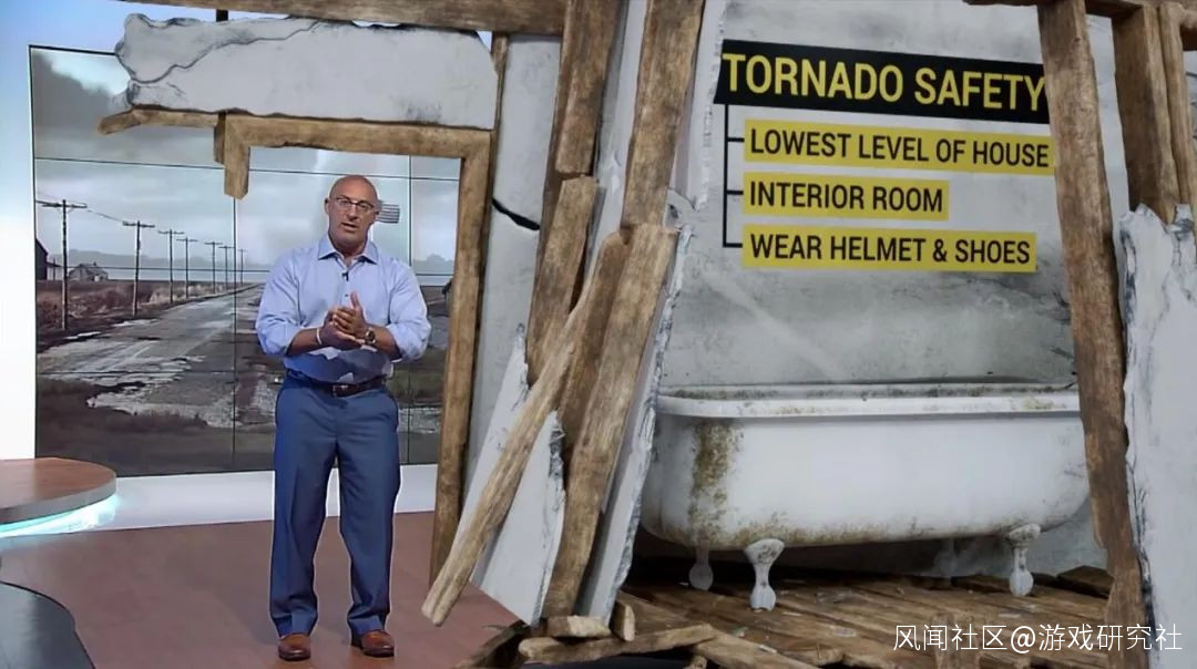 就算主持人待在“更普通”的演播間裏,他們也能整出新活,讓這場天氣預報來得更加生動和直觀。比如為了展現風暴的破壞力,將它肆虐掃蕩後的建築殘骸搬進直播間。