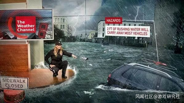 就像我們最能從電視中感受到颱風天風力的時候,往往是哪些記者在狂風中抱着電線杆,聲嘶力竭大喊着“我説不出話”的時候。Weather Channel把主持人派到這些虛擬的災害氣象中,既讓他們避免了直面危險,也達到了讓人感同身受的效果,因此大受好評。