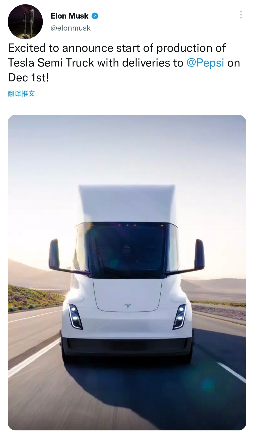本月初,馬斯克發佈推特稱特斯拉 Semi Truck 即將於今年 12 月 1 日開啓交付,首批客户是百事。隨即馬斯克又在評論區補充道:它擁有 500 英里續航和極高的駕駛樂趣。