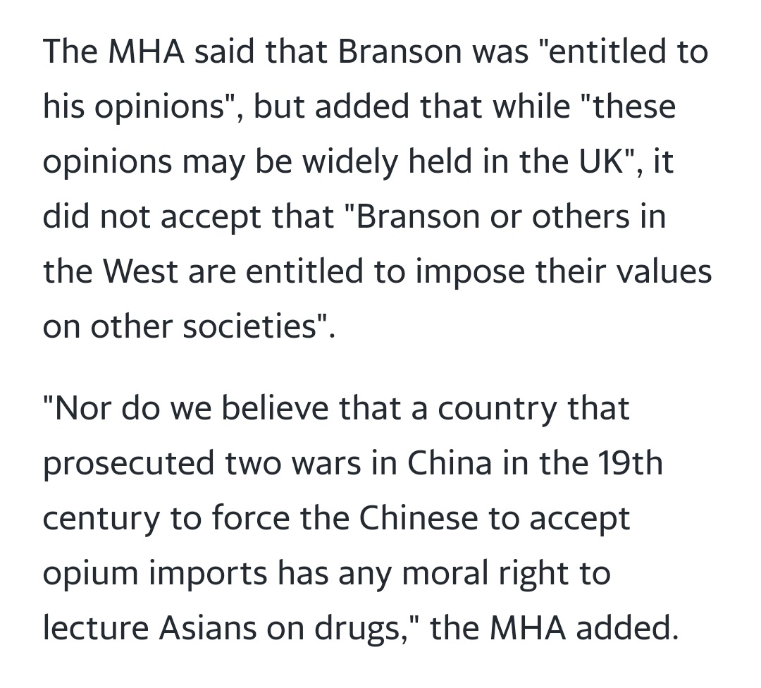 布蘭森先生可以有自己的意見。這些意見可能在英國被廣為接受,但我們不接受布蘭森先生或其他西方人士將自身價值觀強加於人。我們也不相信一個曾在19世紀為逼迫中國人接受鴉片而發動兩次戰爭的國家,有任何道德資格在毒品問題上教訓亞洲人。