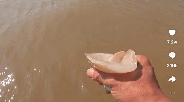 趕海視頻裏,博主拎着小桶,一隻手抓住貓眼螺一擠就呲呲冒水。