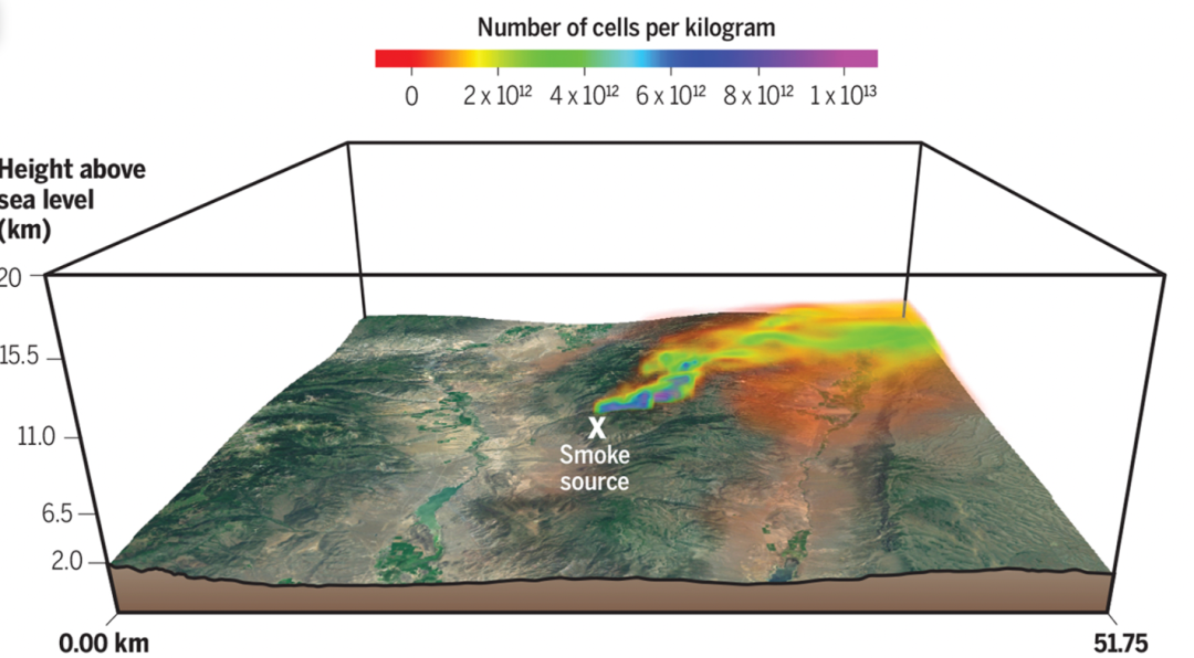 模擬山火中微生物細胞的傳播潛力。|Science