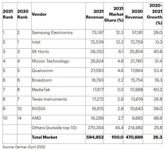 回顧半導體產業的發展脈絡,PC的出現帶動了半導體行業第一批巨頭的崛起,到2010年以後,全球半導體行業從PC時代進入智能手機時代,重新開啓了新一輪快速成長期。但當前半導體行業的格局其實從PC時代就基本穩定,根據Gartner公佈的2021年十大半導體企業榜單,我們看到,榜單上還是英特爾、美光科技、AMD、英偉達等熟悉的“面孔”。