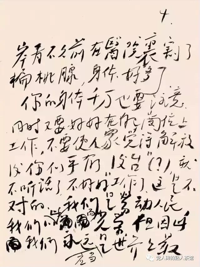 “要好好在自己崗位上工作,不要使人家覺得解放後你似乎有了‘後台’就不聽話了,不好好工作了,這是不對的。我們是勞動人民,我們以此而光榮,但因此我們永遠應當是世界上最忠實、最純潔、最勤勞、最樸素、最剛強而又善良的人。望你永遠不失這種偉大工人階級的優良品質!寶貴這種偉大的優良品質,去掉一切不好的非工人階級的品質**!**”