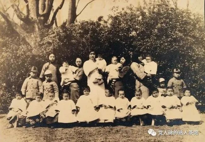1931年,大同幼稚園部分保育人員和幼兒合影於法國公園。二排左一、右一、右二分別為毛澤東之子毛岸英、毛岸青、毛岸龍