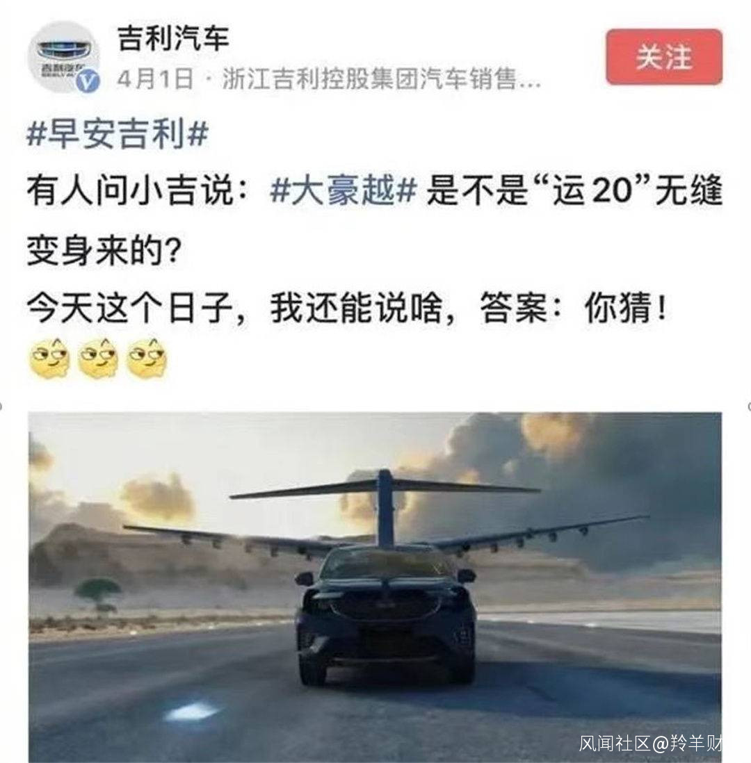 不恰當營銷,吉利不止一次了。2020年3月,吉利竟使用運20運輸機作背景,宣傳豪越的大尺寸。這一行為引發中航工業的不滿,並向吉利發出警告函稱:吉利豪越品牌擅自發布其“運20”飛機形象,並配以《握指成拳、共克時艱,吉利豪越與運20共同開發陸空一體化戰略運輸時代》文案。吉利豪越還有一系列視頻、海報等宣傳材料同樣被指侵權。中航工業曾於就上述侵權事宜,與吉利汽車進行溝通,後者亦暫時停止了相關侵權行為。